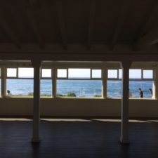 The large main room, measuring approximately 25 feet by 45 feet, is light and airy, with one entire wall filled with windows overlooking the ocean; the opposite wall overlooks the patio and lawn. The room contains six columns, enhancing the appearance.. A mural by local artist Rik Erickson adorns one wall inside the main room, as well as the wall above the span of west-facing windows extending the length of the room. It is estimated that this room will comfortably accommodate up to 100 people, seated at tables.