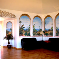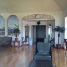 There is a separate entertainment room, perfect for music and dancing. This room has hardwood floors, eliminating the need for bringing in a dance floor. The room is furnished with several sofas, chairs and tables. These, along with the potted plants, create a beautiful atmosphere for dancing or simply listening to the music. The walls in this room are hand-painted by Rik Erickson as well. It is estimated that about 50 or 60 people can fit into this room while dancing.