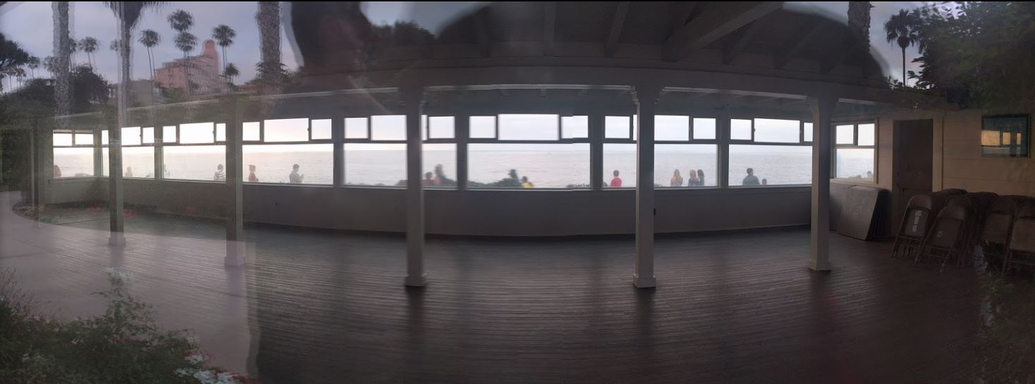 The large main room, measuring approximately 25 feet by 45 feet, is light and airy, with one entire wall filled with windows overlooking the ocean; the opposite wall overlooks the patio and lawn. The room contains six columns, enhancing the appearance.. A mural by local artist Rik Erickson adorns one wall inside the main room, as well as the wall above the span of west-facing windows extending the length of the room. It is estimated that this room will comfortably accommodate up to 100 people, seated at tables.